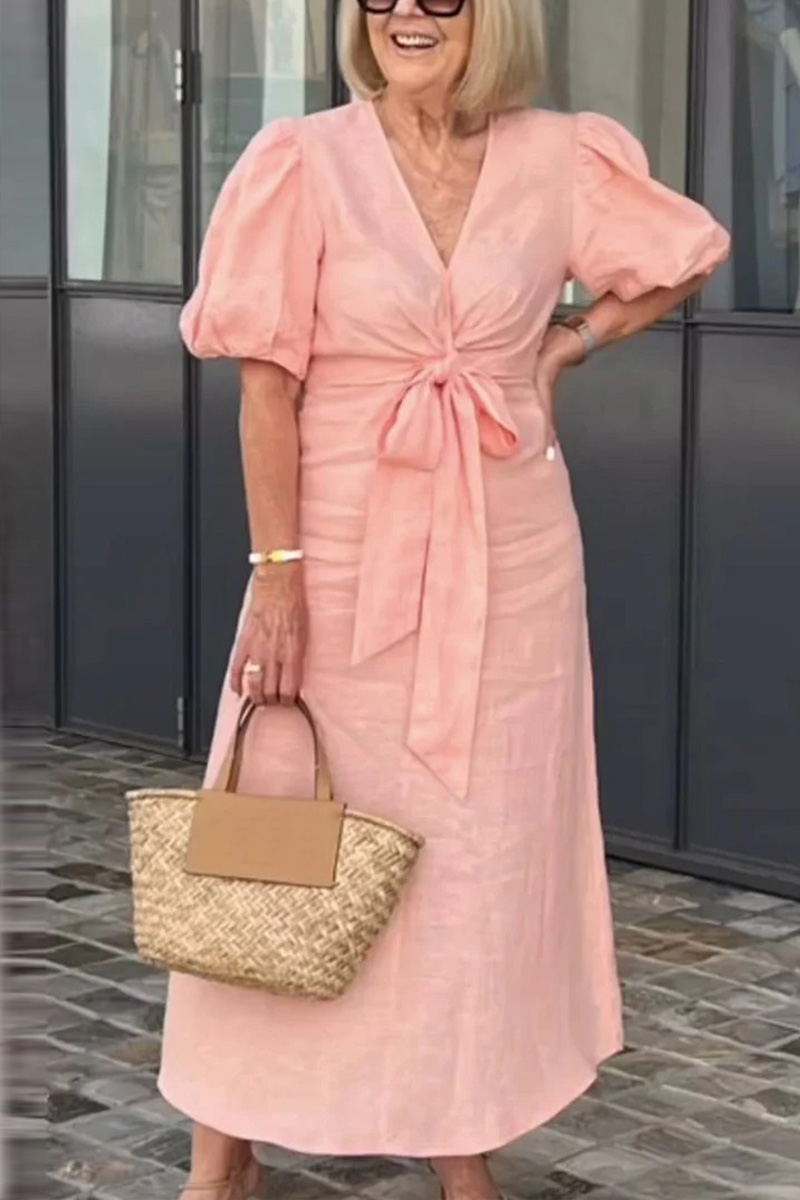 Timeless Elegance: V Neck Tie Puff Sleeve Cotton Dress